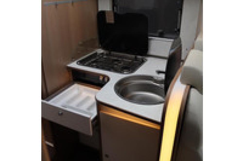 Dankzij het compacte ontwerp, de praktisch ingedeelde kasten met ruimtebesparende tussenschotten en de laden met soft close, laat de hoekkeuken niets te wensen over. Er is ook ruimte voor proviand voor meerdere dagen in de koelkast.