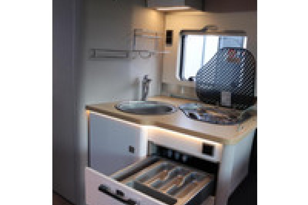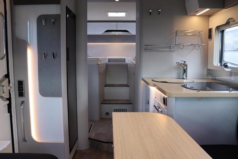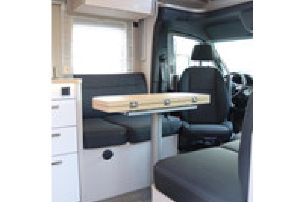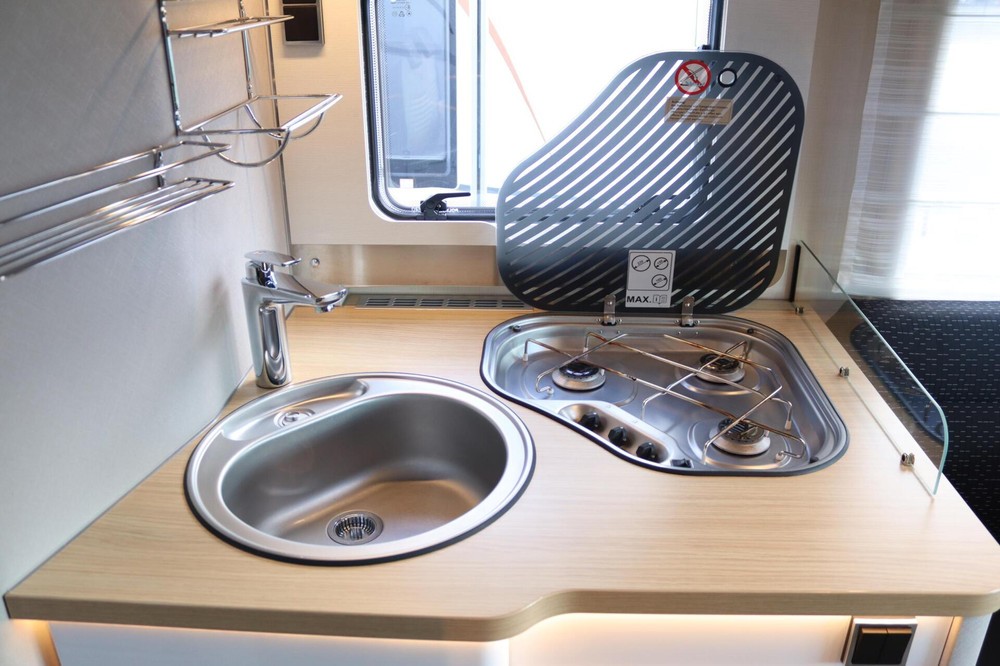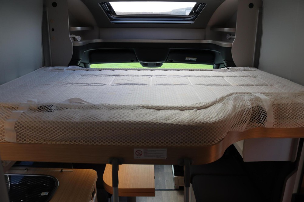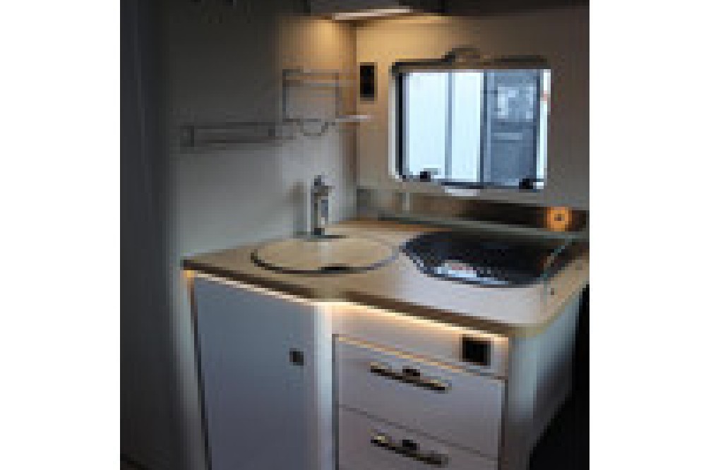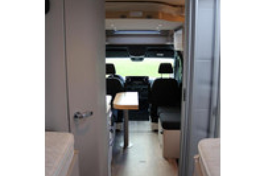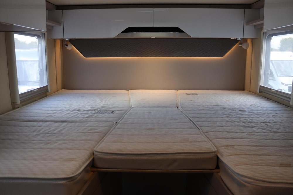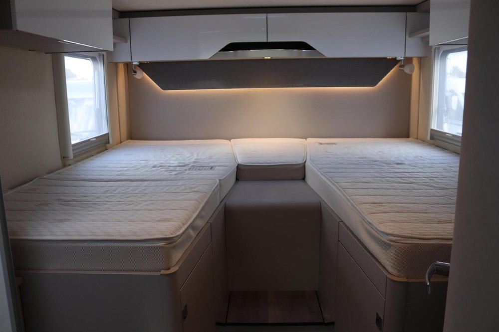 Deze Hymer Tramp S 685 heeft twee eenpersoonsbedden achterin de camper. Hier is ook één groot bed van te maken door een kussen tussen de twee bedden te plaatsen. Ook is de camper voorzien van een ruim elektrisch hefbed boven het zitgedeelte. De sanitaire ruimte biedt precies wat u nodig heeft tijdens uw reizen. Met een ruime gescheiden douche en een aparte toiletruimte. De keuken en de 152l koelkast bevinden zich in het midden van deze indeling tegenover elkaar. Hier kan een fijne maaltijd bereid worden. Een mooie combinatie dus! De Tramp-S 685 wordt afgemaakt door de speciale face to face zitgroep met de luxe stofvariant ''Palm Black'' in combinatie met het meubeldecor in glanzend wit en eiken (Tip Printed).