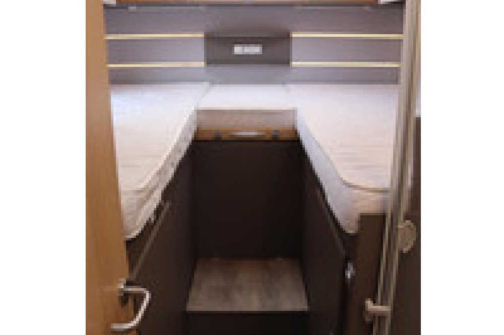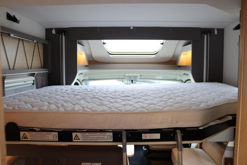 Het praktische hefbed in de Tourer Lift-modellen verdwijnt bijna onzichtbaar in het plafond en is in een handomdraai klaar voor gebruik. Zo ontstaat extra slaapruimte zonder dat het woondeel wordt aangetast – een elegante en ruimtebesparende oplossing voor comfortabel reizen met het hele gezin.