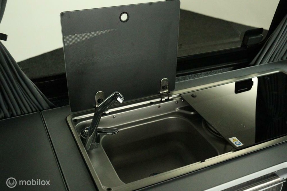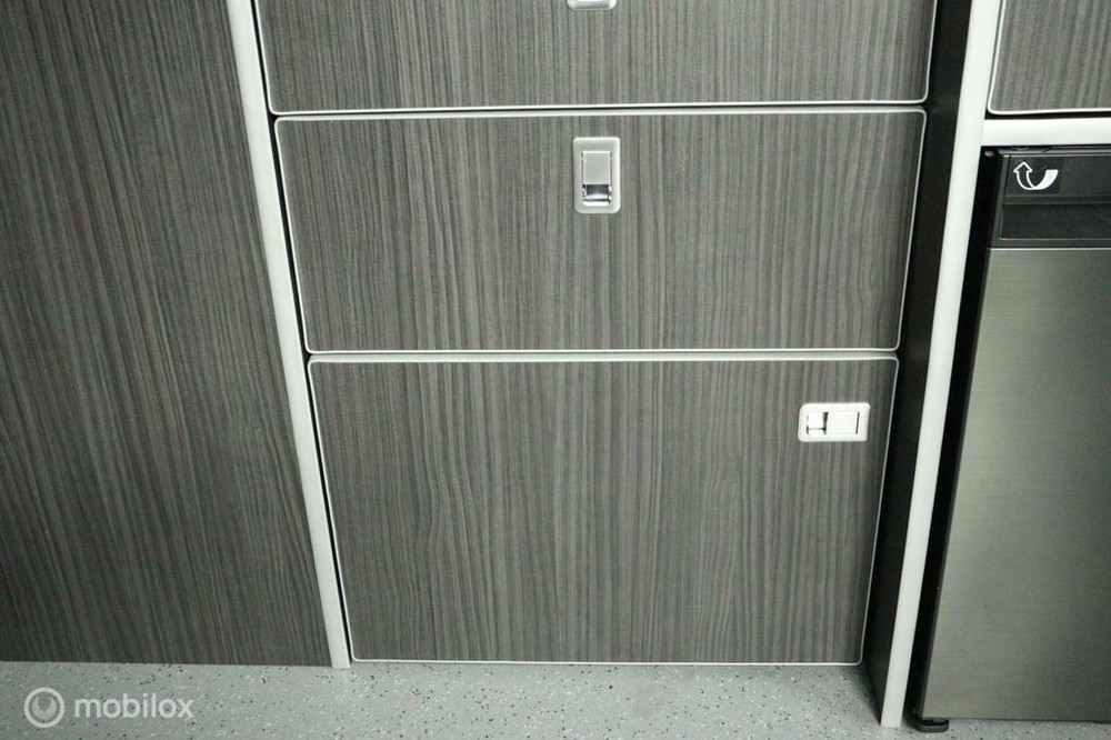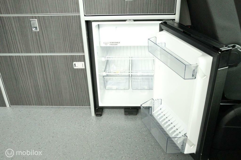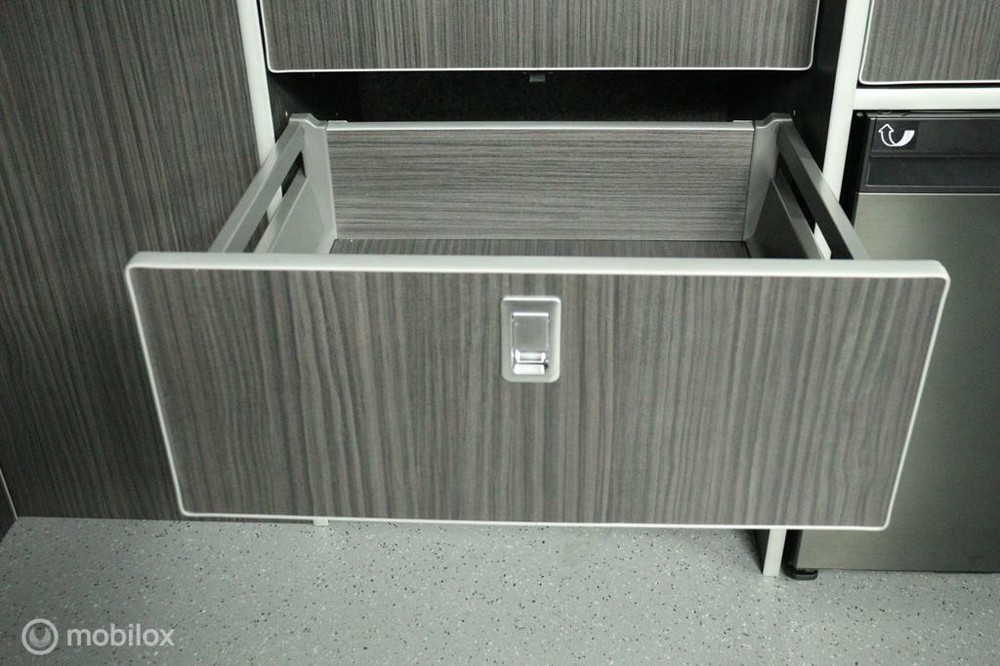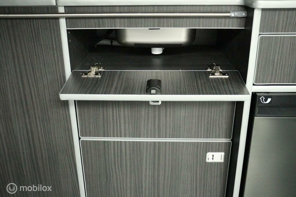 keukenblok bestaat uit een spoelbak met schoon en vuilwater tank en een 2 pits gasstel. Verder een besteklade, dometic compressor koelkast met vriesvakje koelvak heeft een inhoud van 45 liter en verschillende opbergvakjes.